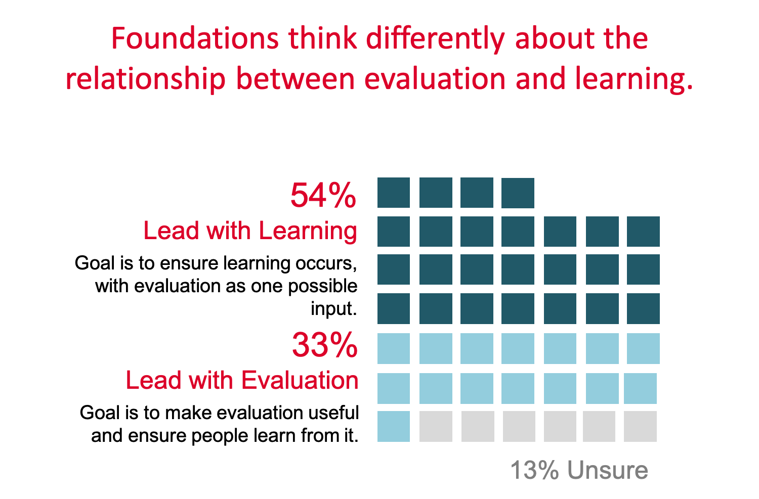 Foundations that fund initiatives or strategies face a major challenge in that multiple decision-makers involved (e.g. grantees, program staff, foundation leadership) have different learning and evidence needs at different times and at different levels–such as individual projects, a cohort of projects and stakeholders, or at a strategy and portfolio level.